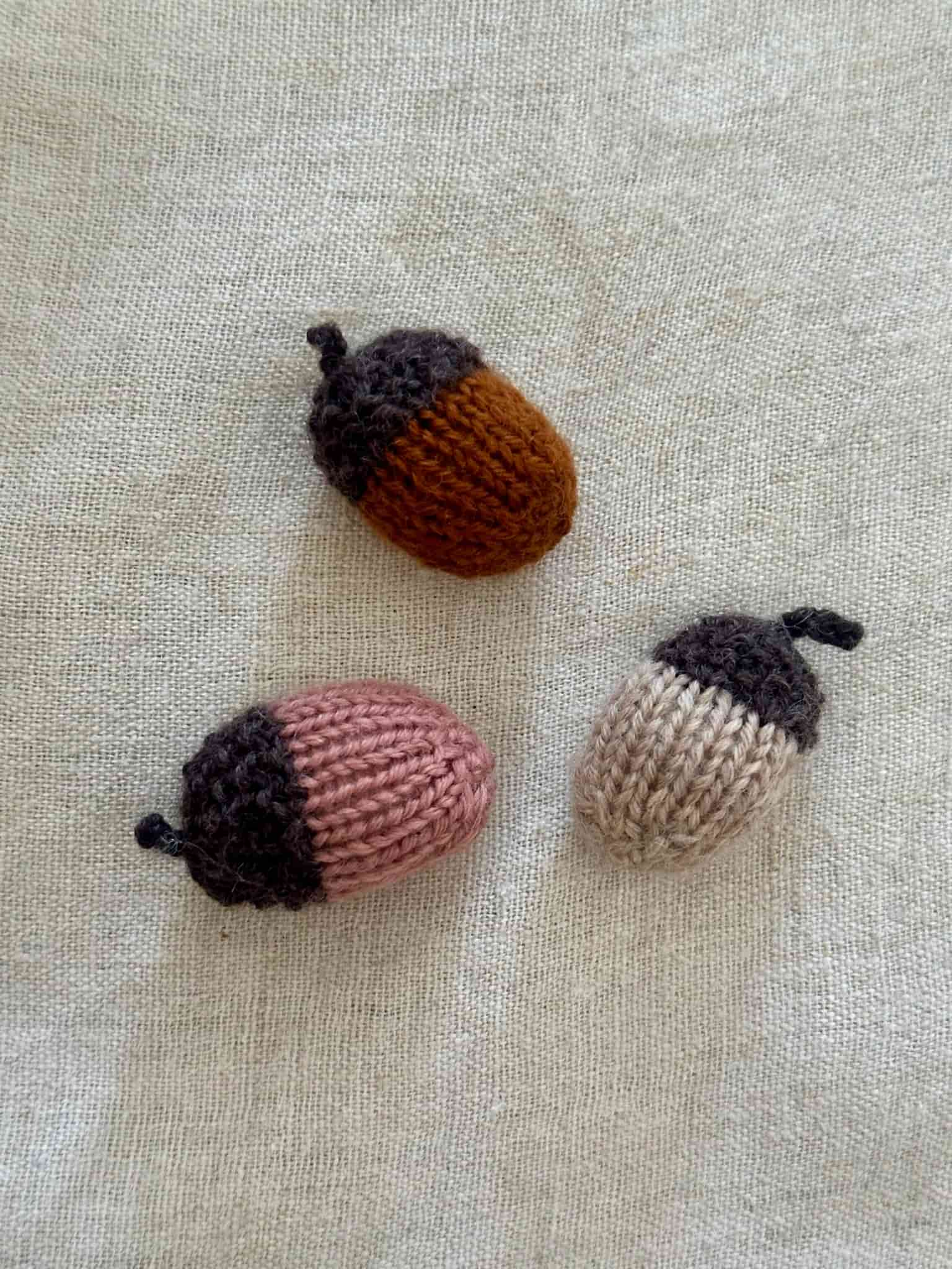 Bittesmå håndstrikkede agern i fine farver med guldsnor. Perfekt som efterårspynt, julepynt, ophæng eller nordisk borddekoration. De små agern er håndstrikkede med kærlighed og sans for detaljer. Hver enkelt er unik, og de kommer i blandede farver, der bringer varme og hygge ind i hjemmet. Find flere farvekombinationer og få 3 forskellige til 135 kr.