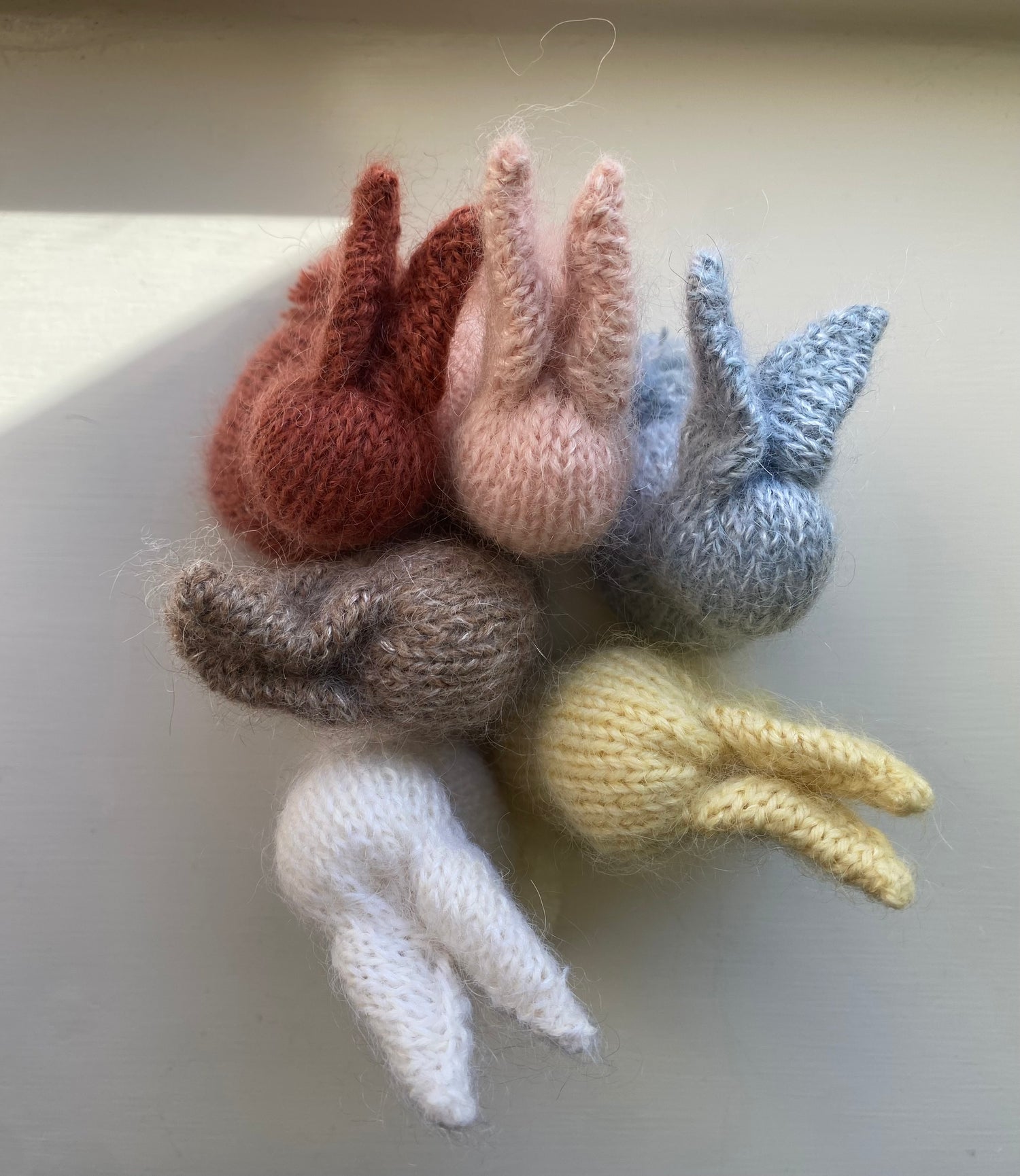 Find nuttede og søde kaniner/harer, der er strikket i alpaca og mohair i seks fine farver: Kaninerne/harerne kan både stå og hænge. Hver eneste af dem er nænsomt formet, har fået øjne og næse, en lille pompomhale af og til sidst en lille sløjfe med klokke om halsen. Find forskellige farver her.