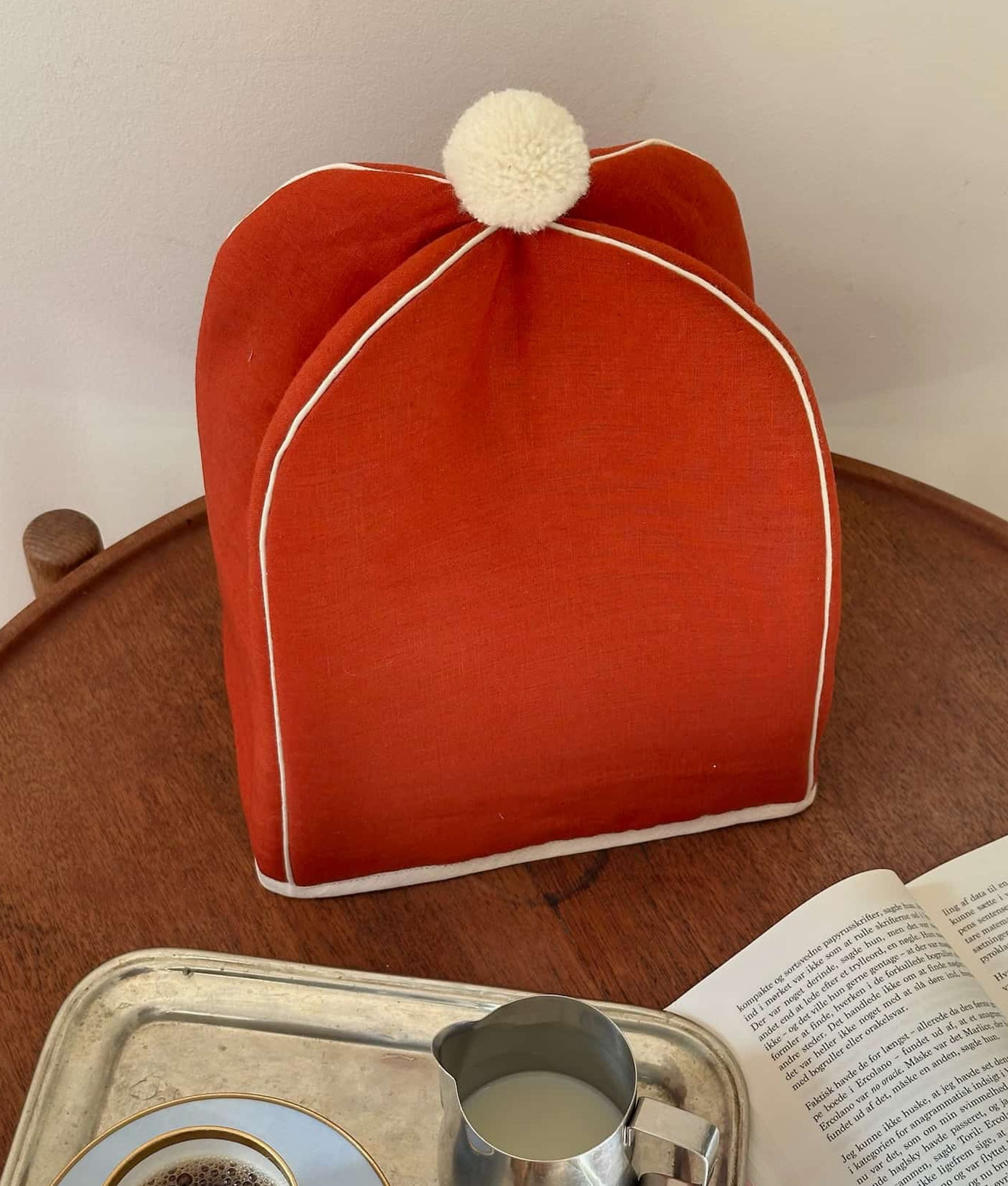 Hold teen eller kaffen varm længere med denne smukke, håndsyede tehætte. Tehætten er syet i en smuk mørk orange hør, kantet med råhvid tittebånd og kantebånd, og toppet med en blød pompon, der giver et hyggeligt og dekorativt udtryk på bordet.