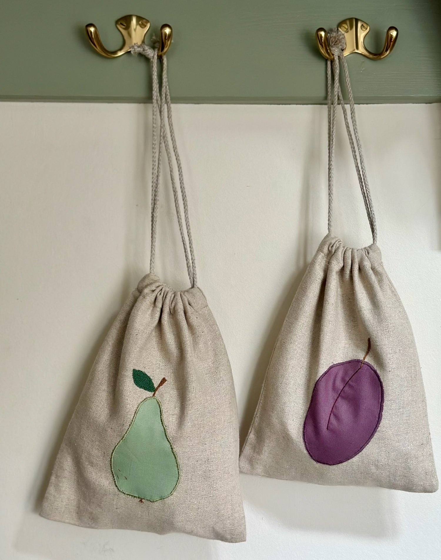 Hver frugtpose er håndsyet i slidstærkt hør og pyntet med en lille påsyet frugt – en sød og praktisk detalje, som børn vil elske. Poserne kan bruges til æbler, gulerødder, vindruer eller andre små snacks og er et miljøvenligt alternativ til engangsplastikposer.