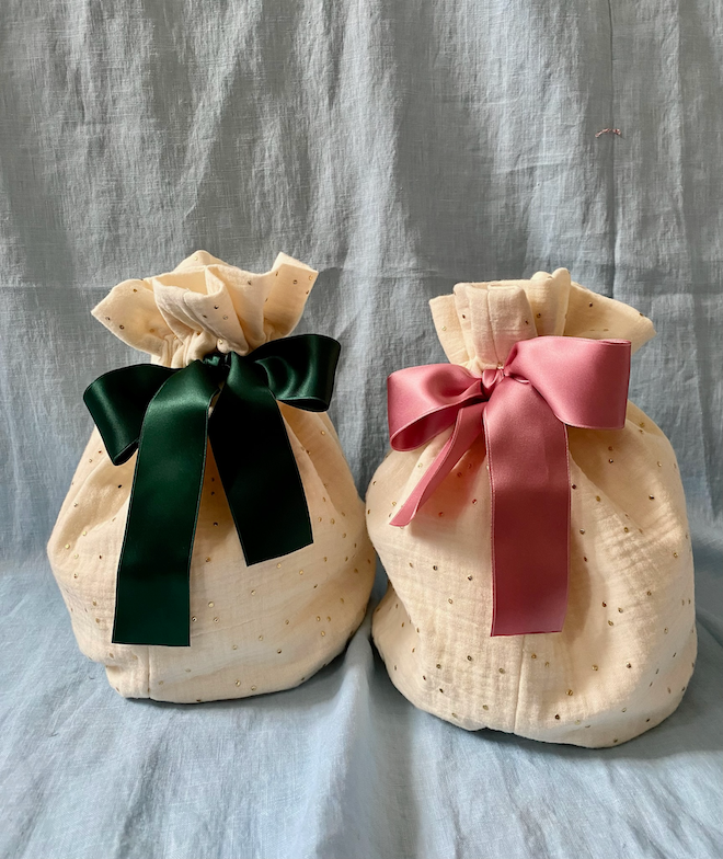 Fin gavepose i stof med guldprikker. Vil både se fin ud på gavebordet eller under træet til jul. Stofposen kan bruges igen og igen - måske er du heldig, at den ender hos dig igen. Og så kan du bruge den til dit strikketøj, til toiletsagerne eller dine allerfineste ting - måske fra Filialen. Se varianter for sløjfens farve her.