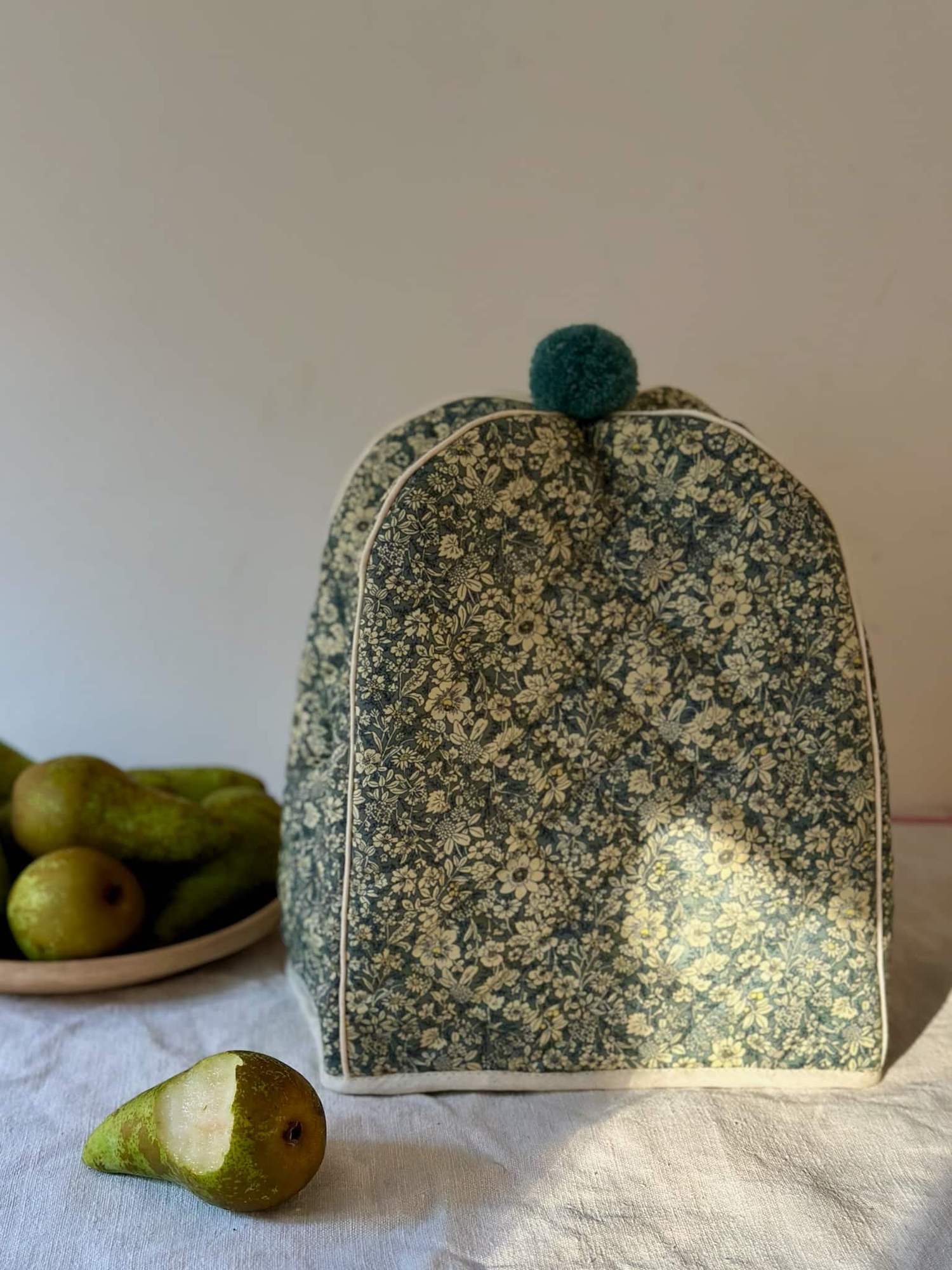 Tehætten er syet i en blomstret bomuld, som jeg har quiltet. Bundfarven er blå/ mørk turkis med råhvide blomster. Den er kantet med råhvid tittebånd og råhvid kantebånd og har en blød pompon i toppen. Hætten er foret med både vat og varmeisolerende thermium, så den kan virkelig holde på varmen! Anvendes både til stempel- og tekanden.