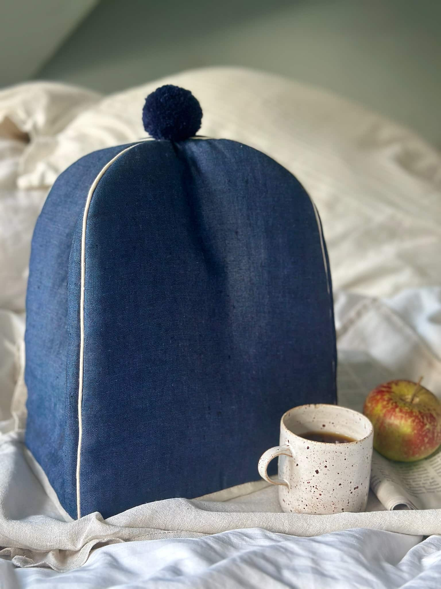 Gør teen eller kaffen ekstra hyggelig med en stilren, håndsyet tehætte i mørkeblå hør. Denne varmeholder er designet til både tekander og stempelkander (op til 1 liter). Tehætten er syet i smuk mørkeblåt hør, kantet med råhvid tittebånd og kantebånd og fuldendt med en blød pompon i toppen – et enkelt og elegant design, der passer ind i både moderne og klassiske køkkener.