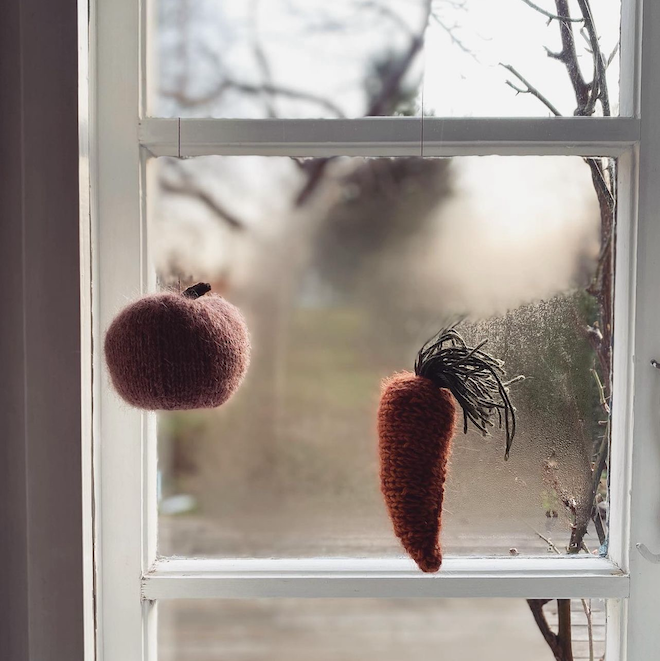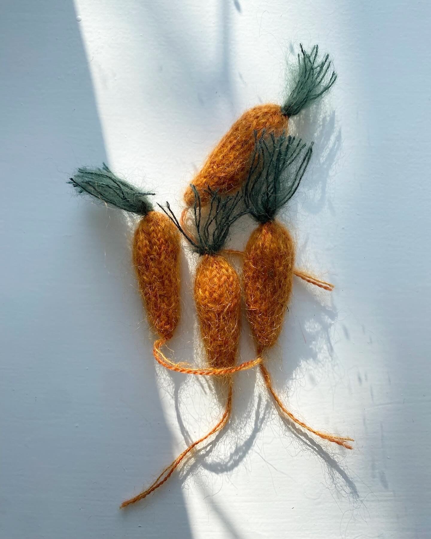 Bittesmå, orange gulerødder strikket af verdens mest tålmodige hænder (ikke mine!). De kommer med en guldsnor i, så de er lige til at hænge i vinduet eller på grene. De er strikket i ren mohair. Lige til at spise.