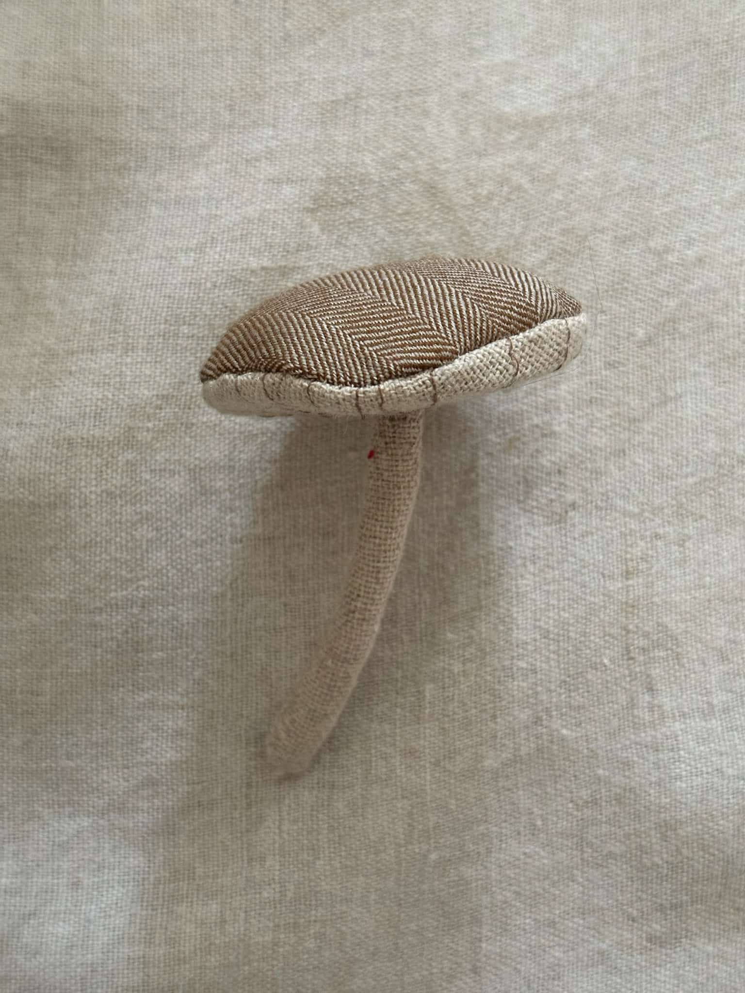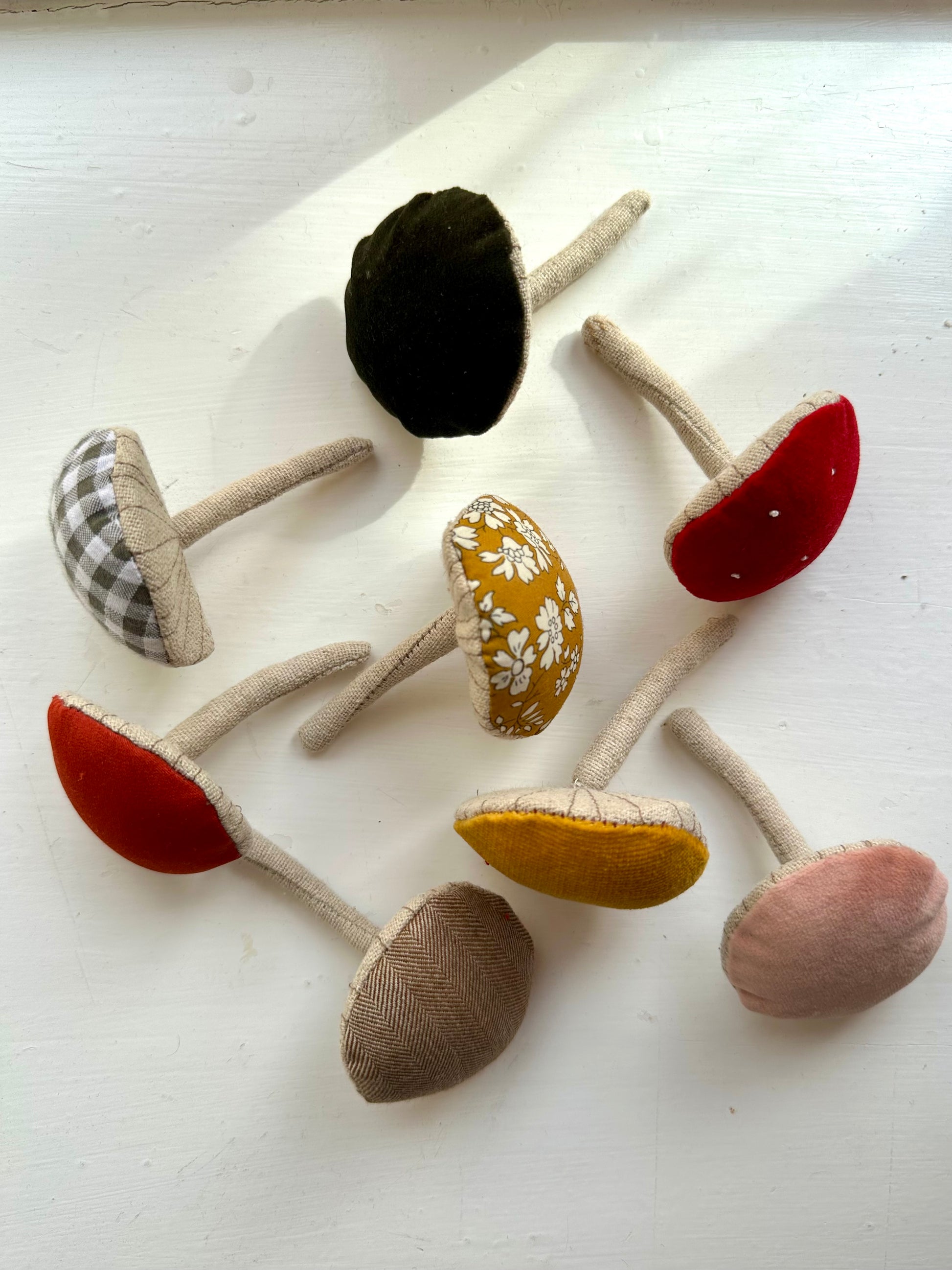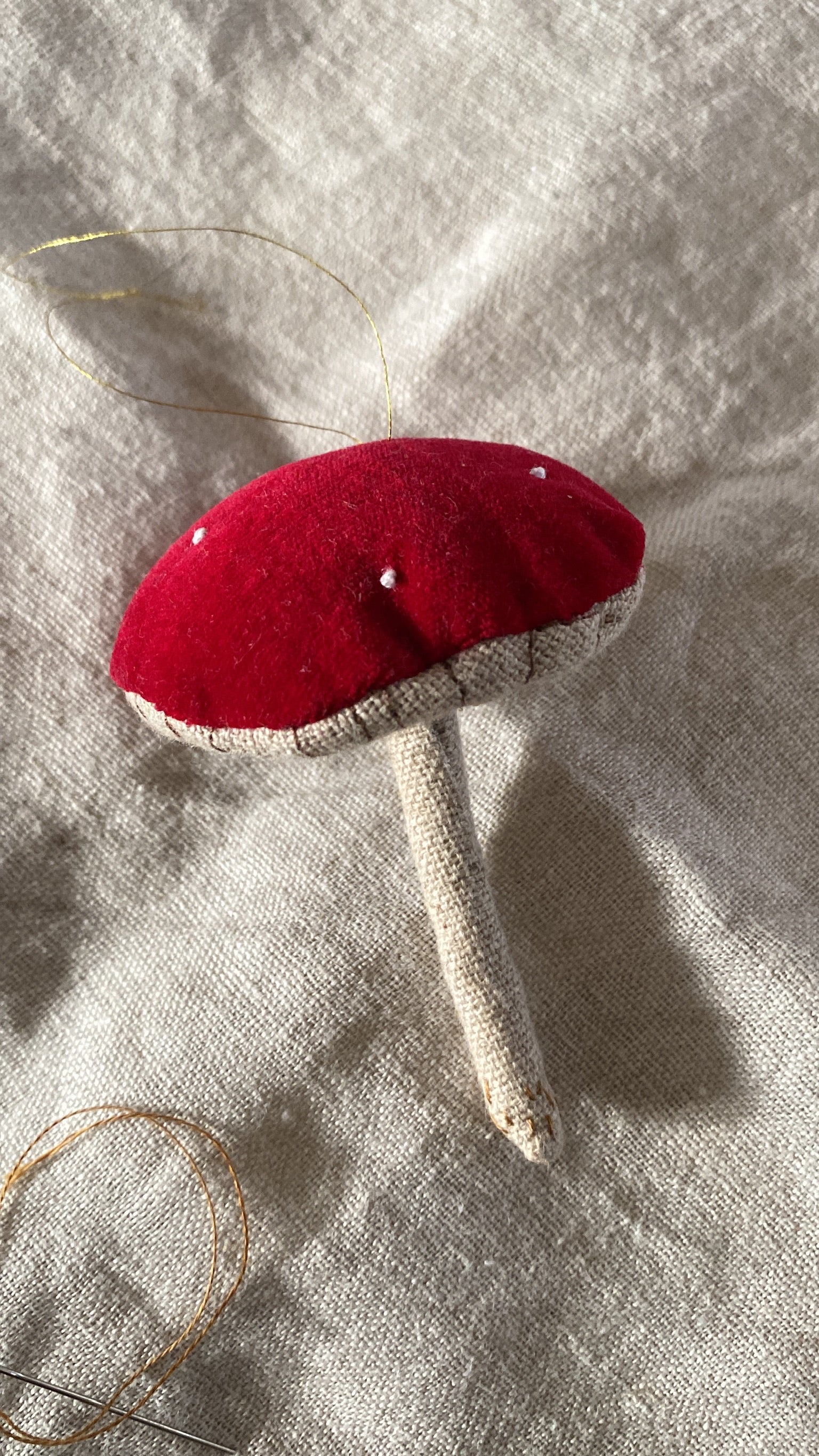 Håndsyede svampe med guldsnor – perfekte til ophæng, dekoration og efterårshygge.