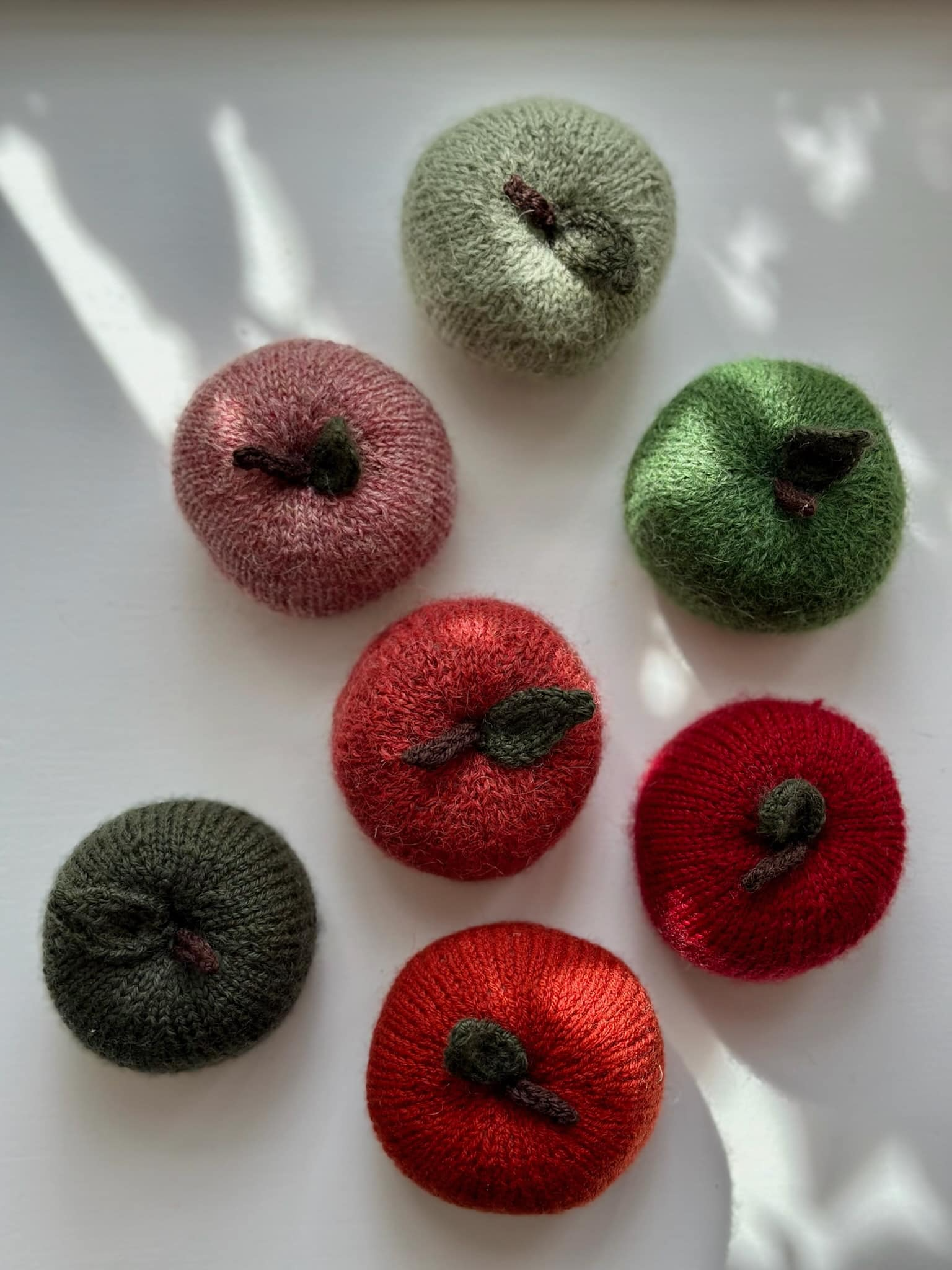 Håndstrikkede æbler i uld – unik årstidspynt i skønne farver.