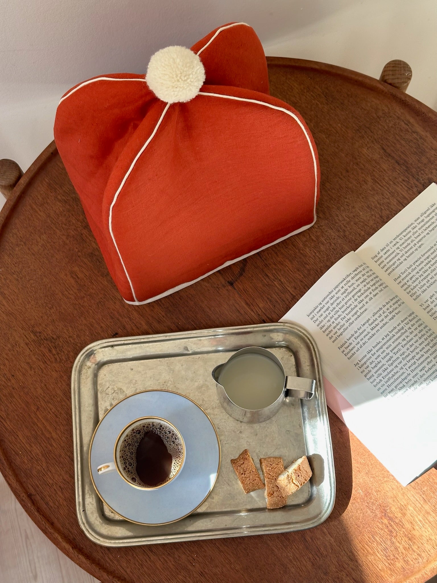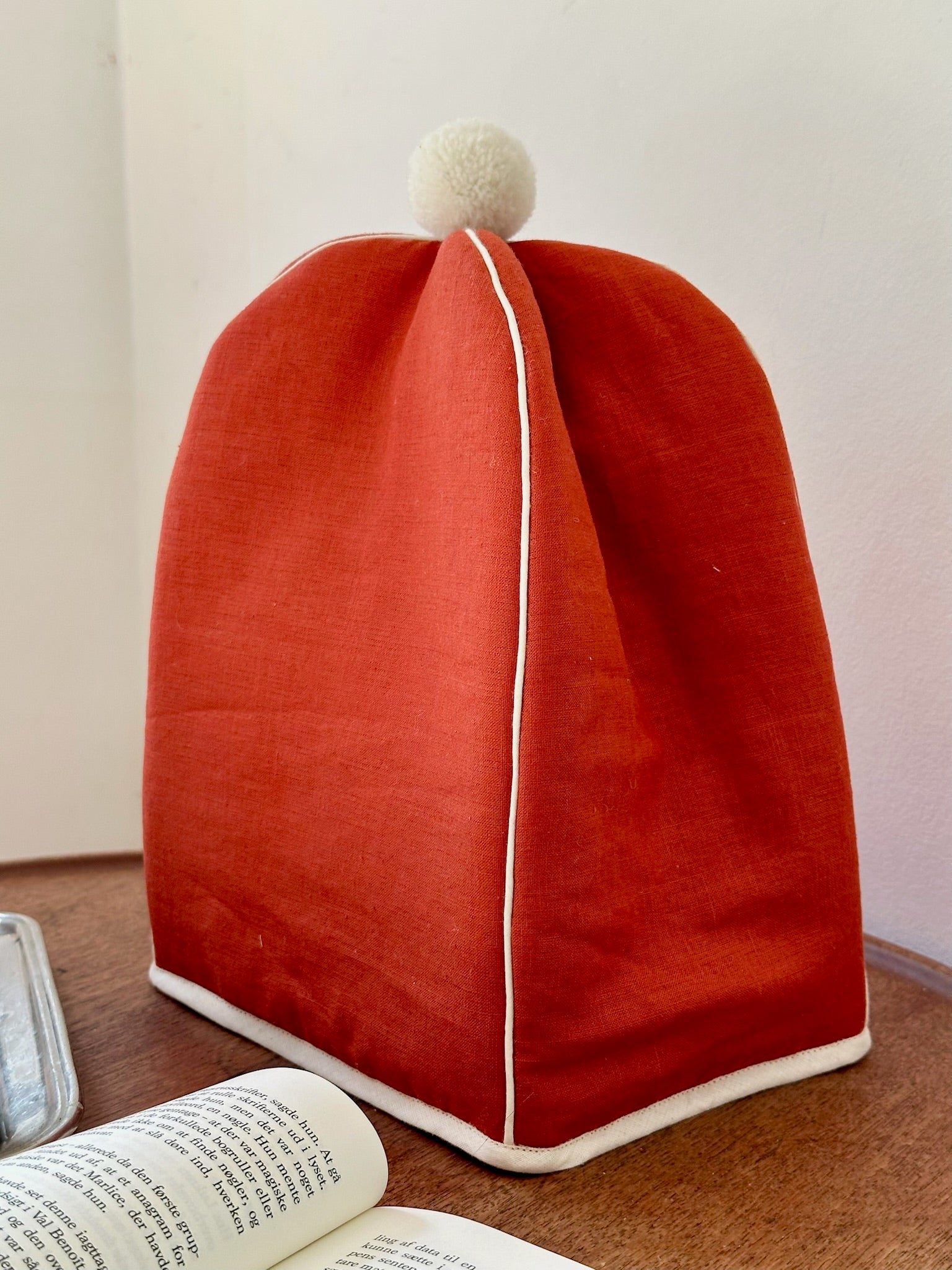 Tehætten er syet i en smuk mørk orange hør, kantet med råhvid tittebånd og kantebånd, og toppet med en blød pompon, der giver et hyggeligt og dekorativt udtryk på bordet.