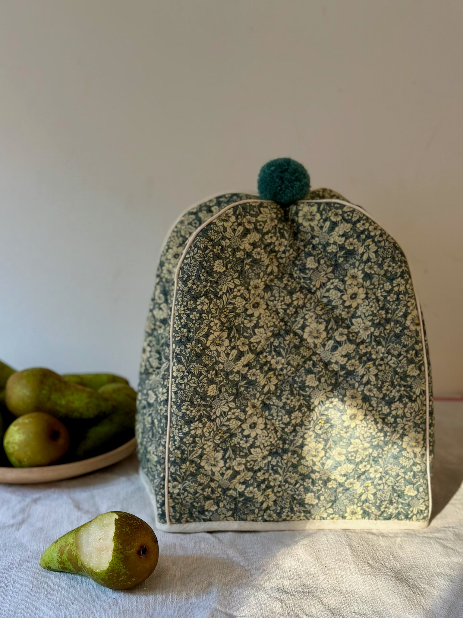 Tehætten er syet i en blomstret bomuld, som jeg har quiltet. Bundfarven er blå/ mørk turkis med råhvide blomster. Den er kantet med råhvid tittebånd og kantebånd og har en blød pompon i toppen.