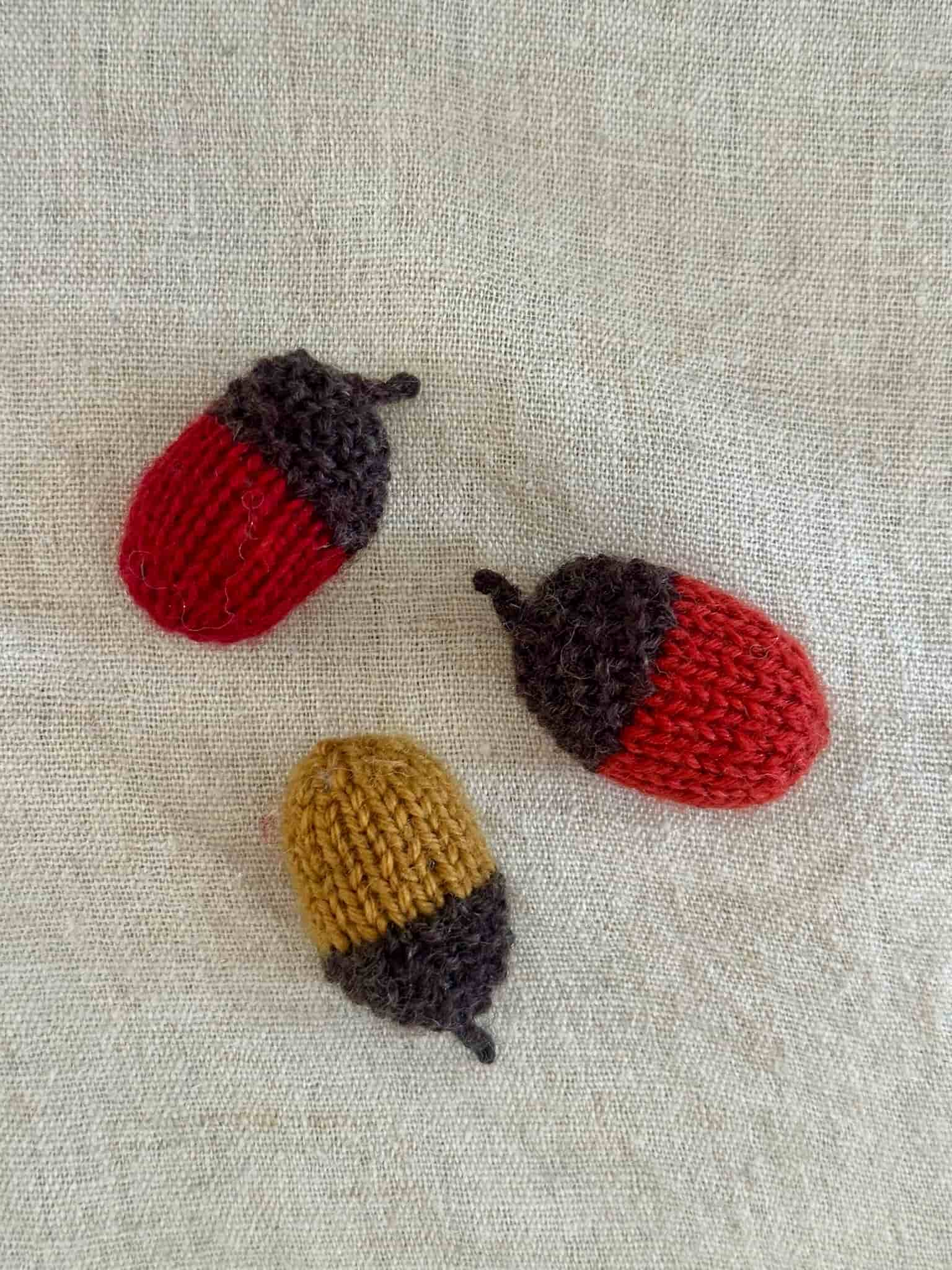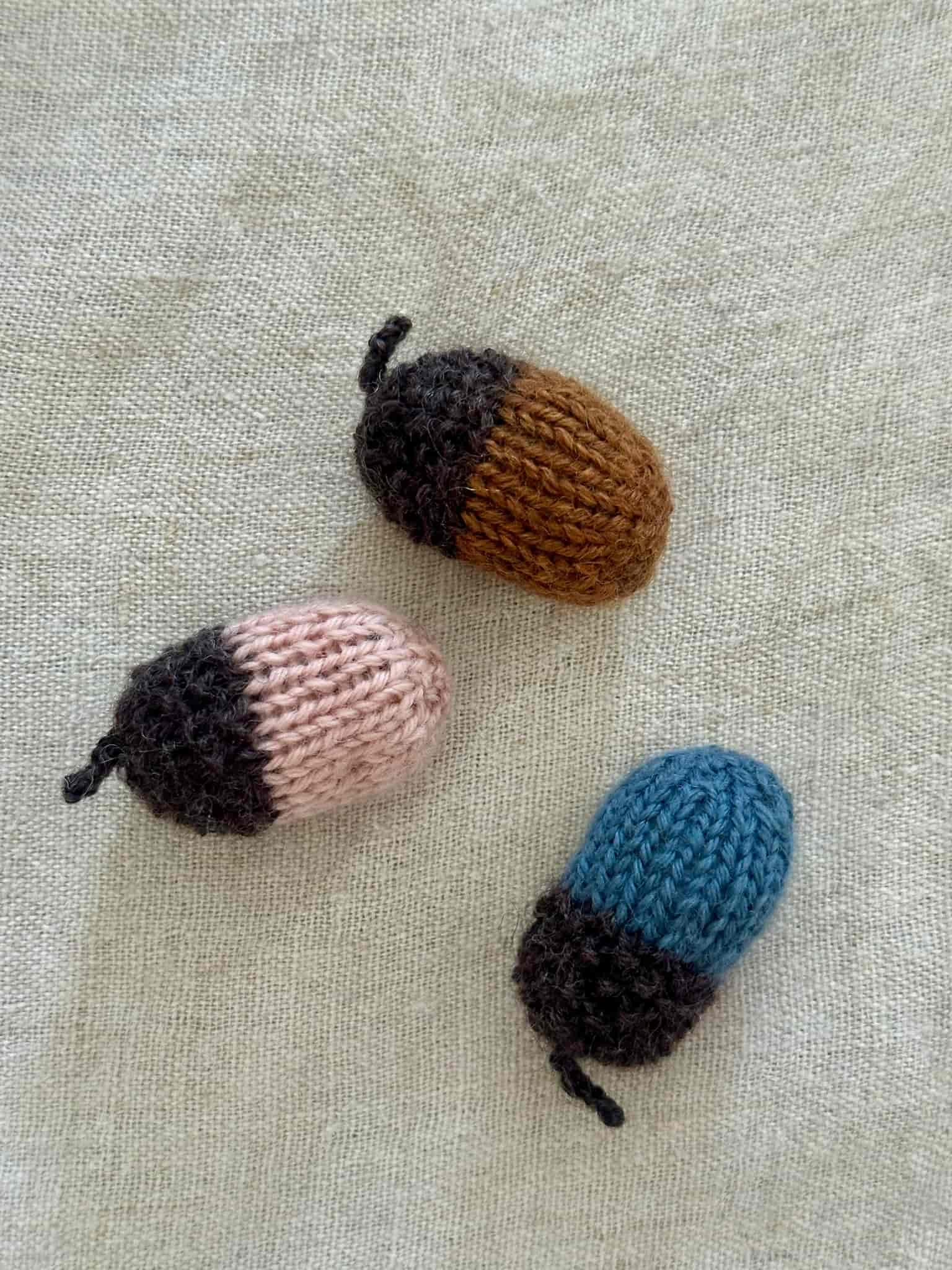 Håndstrikkede agern i fine farver med guldsnor. Perfekt som efterårspynt, julepynt, ophæng eller nordisk borddekoration. De små agern er håndstrikkede med kærlighed og sans for detaljer. Hver enkelt er unik, og de kommer i blandede farver, der bringer varme og hygge ind i hjemmet.