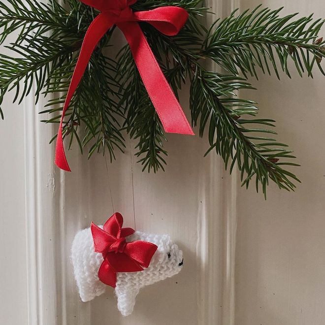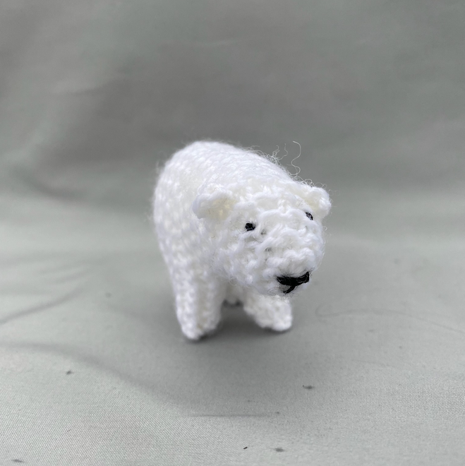 Strikket i kridhvidt garn. Kan både stå eller hænge. Alene ser den sød ud på juletræet eller på en gren. Den passer også sammen med isbjørnemor og isbjørnefar og indgår sammen med igloen i det hyggeligste vinterlandskab.