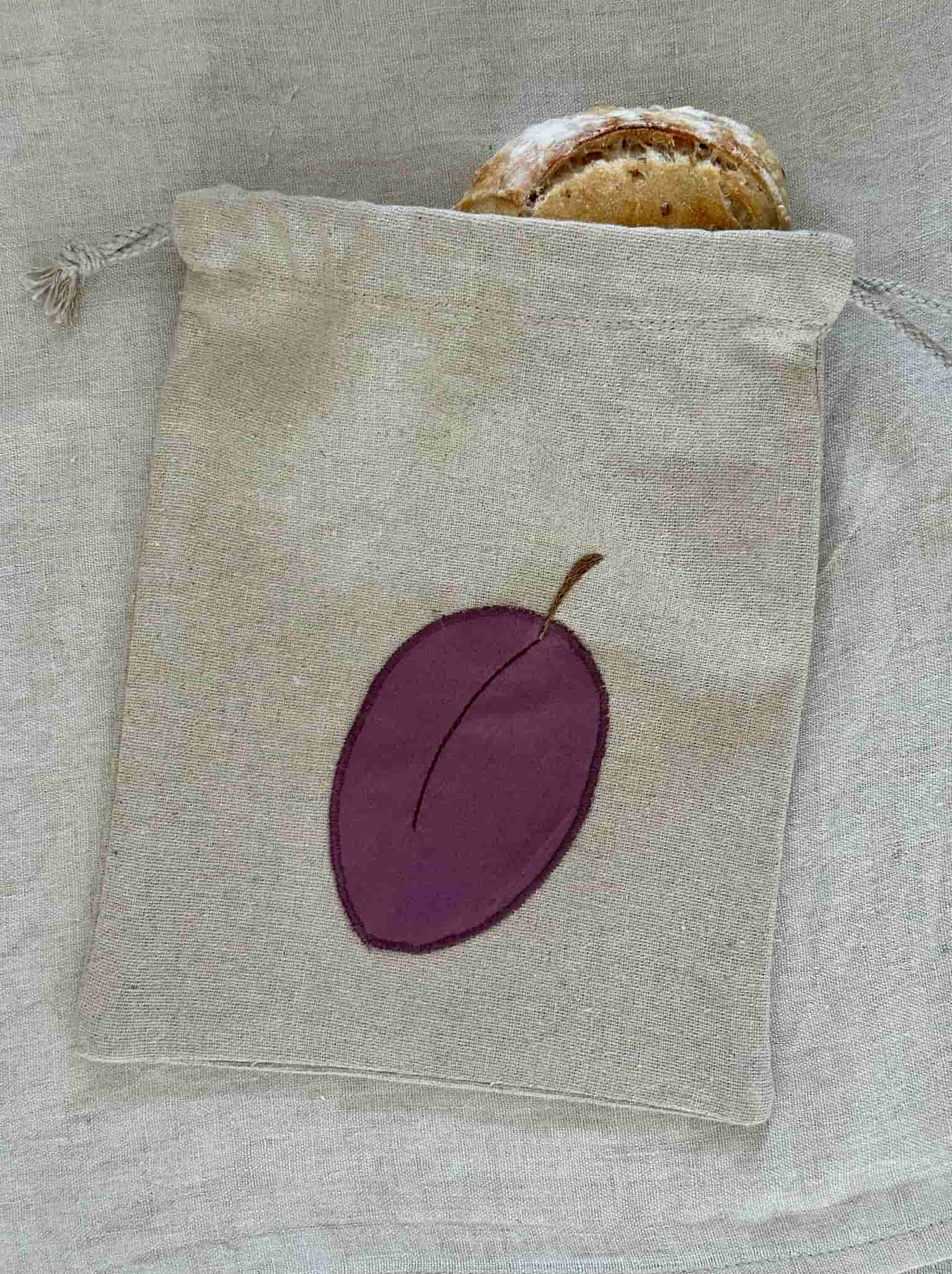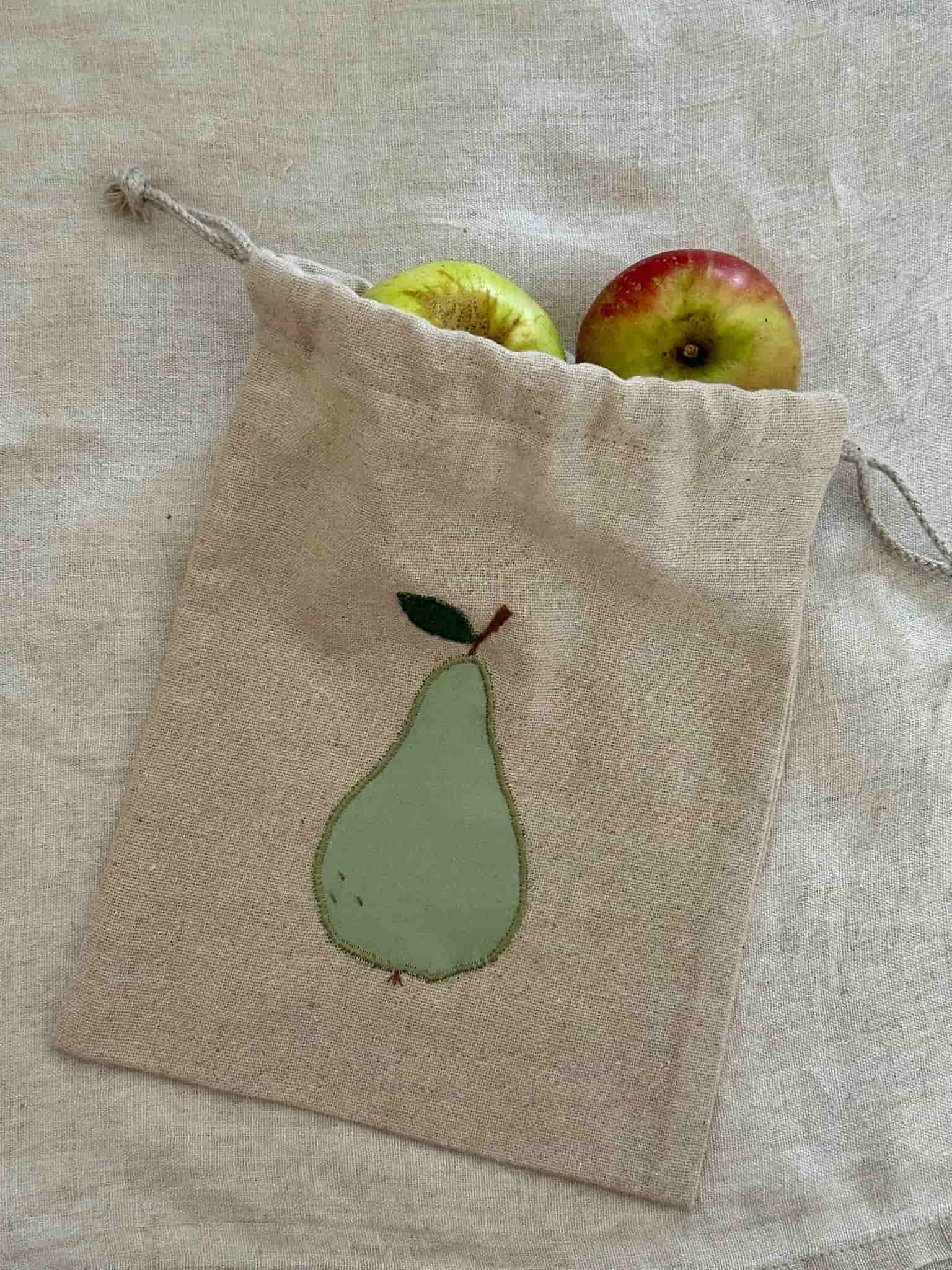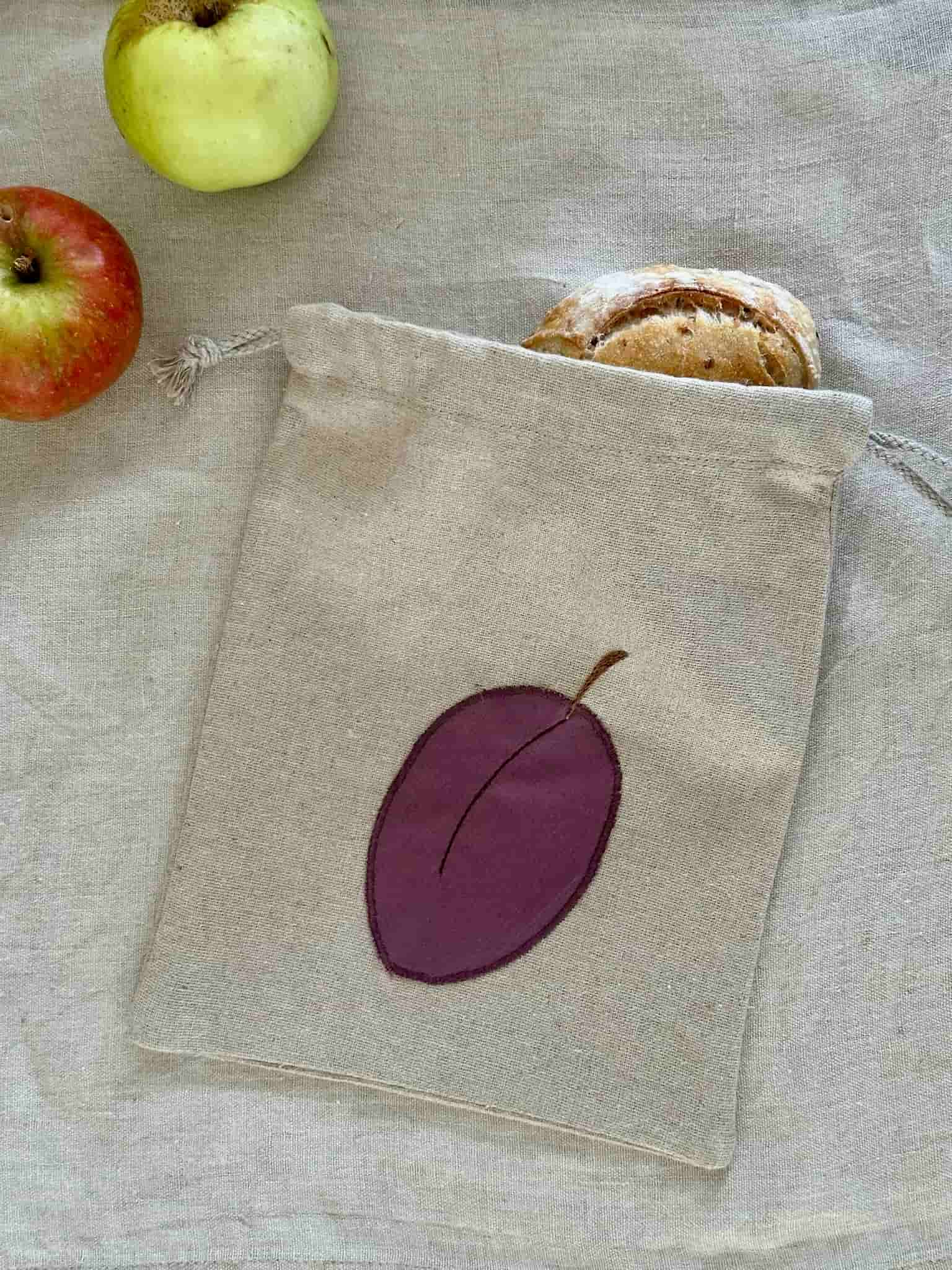 Hver frugtpose er håndsyet i slidstærkt hør og pyntet med en lille påsyet frugt – en sødt og praktisk detalje, som børn elsker. Poserne kan bruges til æbler, gulerødder, vindruer eller andre små snacks og er et miljøvenligt alternativ til engangsplastikposer.